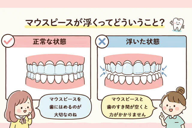 マウスピースが浮いた状態では歯に力がしっかりとかからず、治療が計画通りに進みません。そのような状態が長く続くと、治療計画のやり直しや、マウスピースの再作製が必要になることが多く、費用や新たな治療期間がかかる可能性があります。