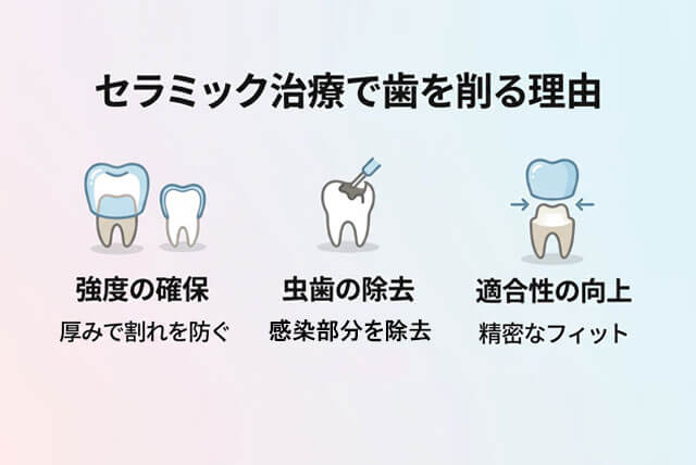 セラミックは陶器と同じような性質を持ち、強度を保つためには一定の厚みが必要です。薄すぎると割れやすくなるため、歯を削ってスペースを確保します。